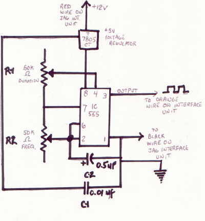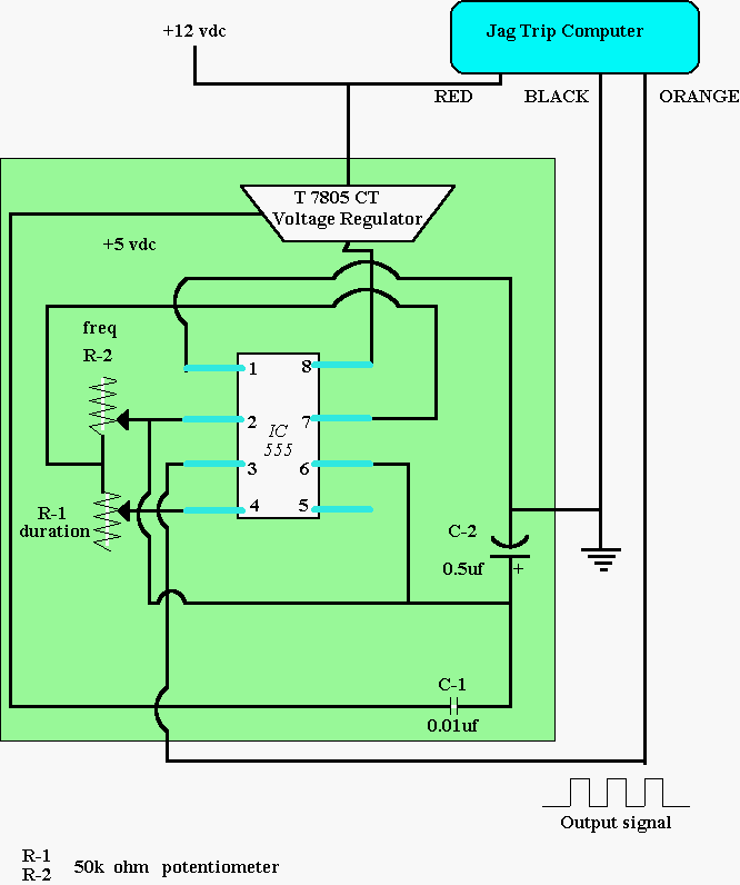 It has to do with the way the timer chip charges and discharges. C1 is the basic frequency for the osc. and R1 and R2 control pulse width and separation. The trick is to come up with the proper values (andresolution) that the Jaguar circutry can handle. If it's too high/low a resolution or frequency the Trip Computer freaks out.