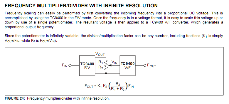 It's a pulse-width-to-number-of-pulses converter. The rate is approximately 1 output pulse per 3.3ms of input pulse time, with a floor of 1ms subtracted off the input pulse time (i.e. you get one output pulse for a 4.3ms input pulse, and two output pulses for a 7.6ms input pulse, and so on.) The input pulses are assumed to be coming in constantly, at about one every 75ms at idle, and more frequently at higher RPMs. The output pulse rate varies smoothly with the input pulse width and rate; it does not only change at intervals like I may have implied above when giving some specific numbers.