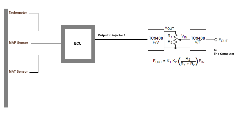 It's safe to assume that the different Interface Units in cars with different engines simply alter this timing/pulse ratio, since the trip computers are all the same. If the trip computer is expecting a certain number of pulses per gallon, the Interface Unit has to be designed so that the width and number of injection pulses that deliver a gallon of fuel in that engine, generate that number of pulses on the Interface Unit output pin.